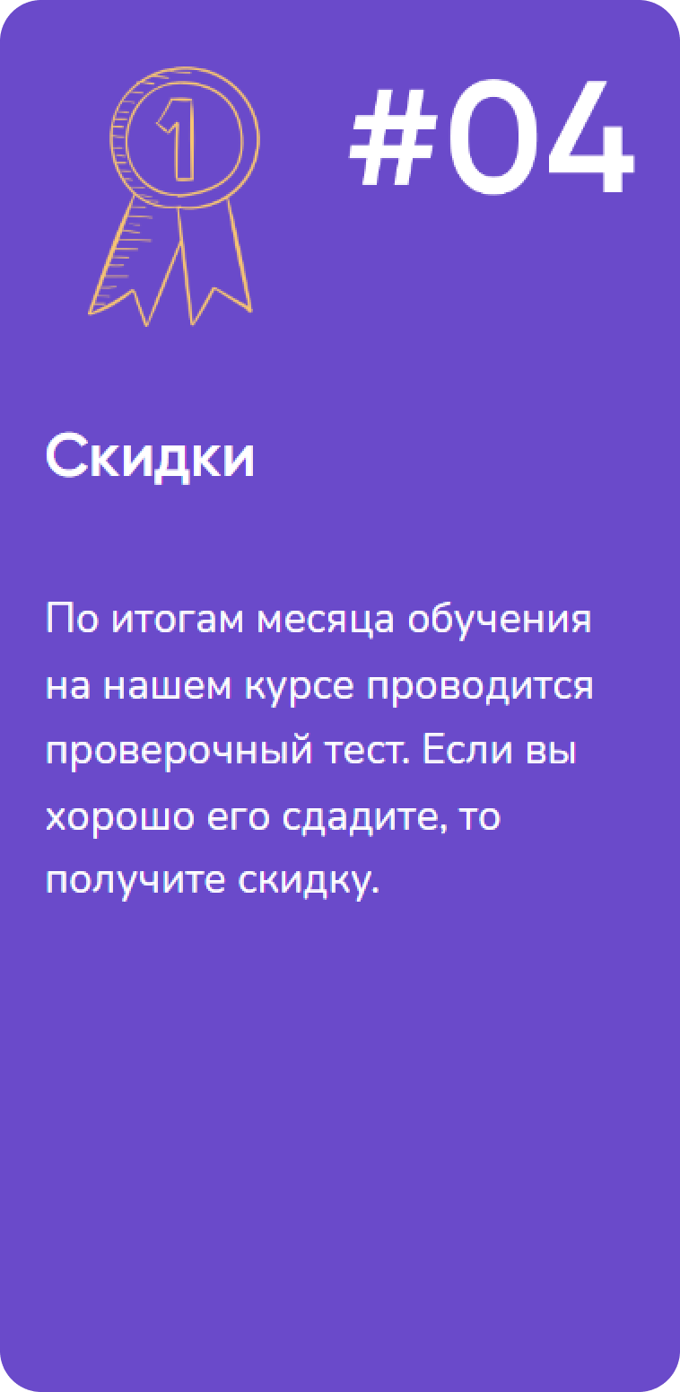 По итогам месяца обучения на нашем курсе проводится проверочный тест. Если вы хорошо его сдадите, то получите скидку.