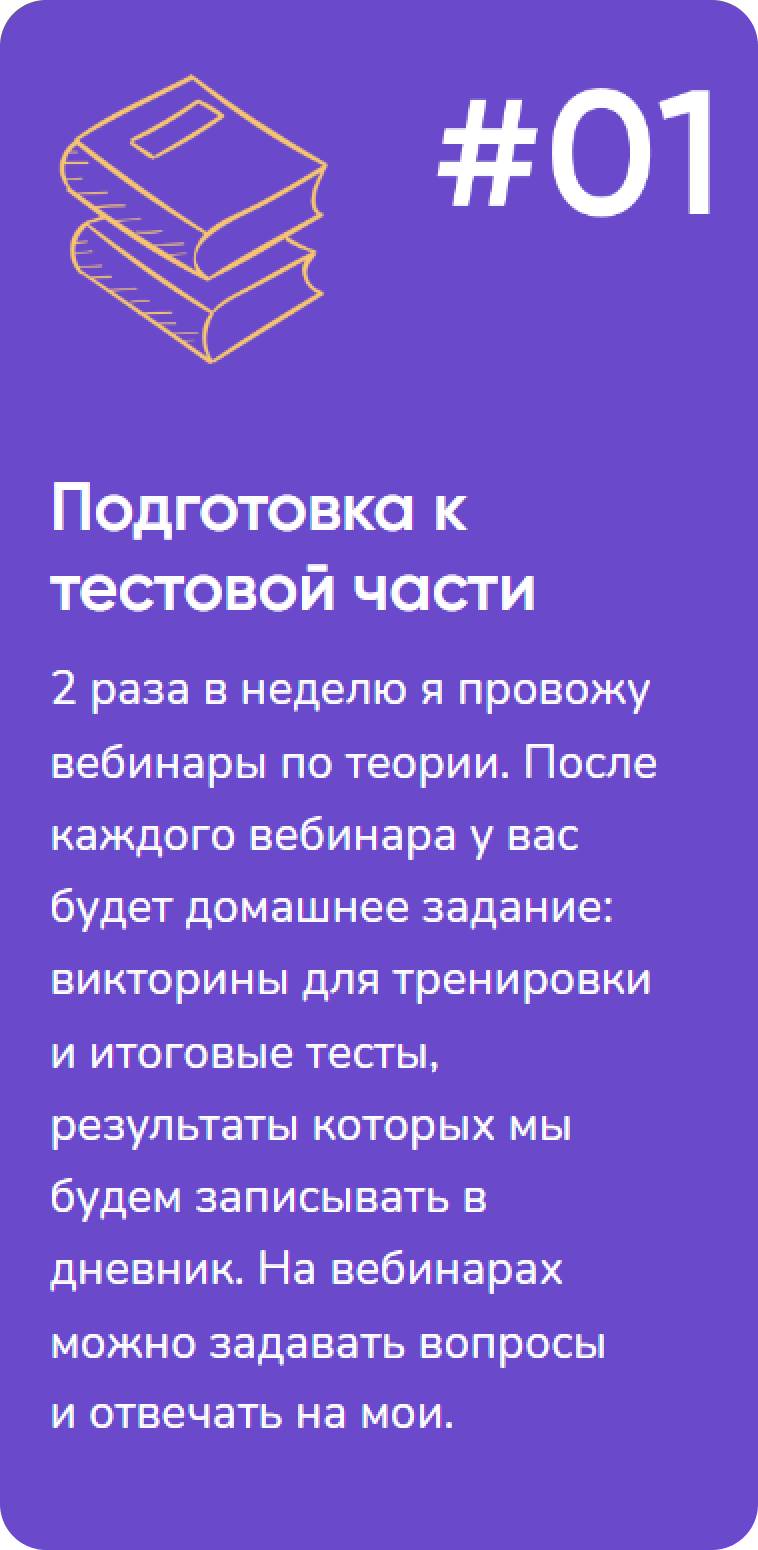 2 раза в неделю я провожу вебинары по теории. После каждого вебинара у вас будет домашнее задание: викторины для тренировки и итоговые тесты, результаты которых мы будем записывать в дневник. На вебинарах можно задавать вопросы