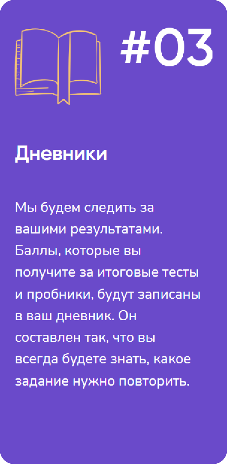 Мы будем следить за вашими результатами. Баллы, которые вы получите за итоговые тесты и пробники, будут записаны в ваш дневник. Он составлен так, что вы всегда будете знать, какое задание нужно повторить.