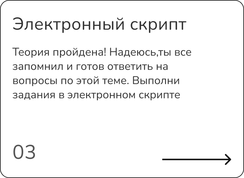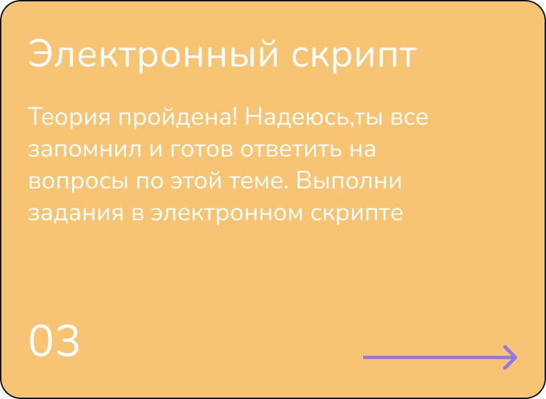 Теория пройдена! Надеюсь,ты все запомнил и готов ответить на вопросы по этой теме. Выполни задания в электронном скрипте