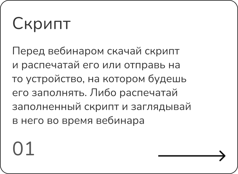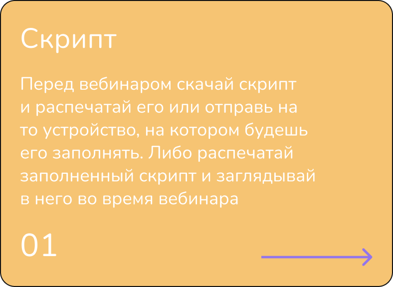 Перед вебинаром скачай скрипт и распечатай его или отправь на то устройство, на котором будешь его заполнять. Либо распечатай заполненный скрипт и заглядывай в него во время вебинара